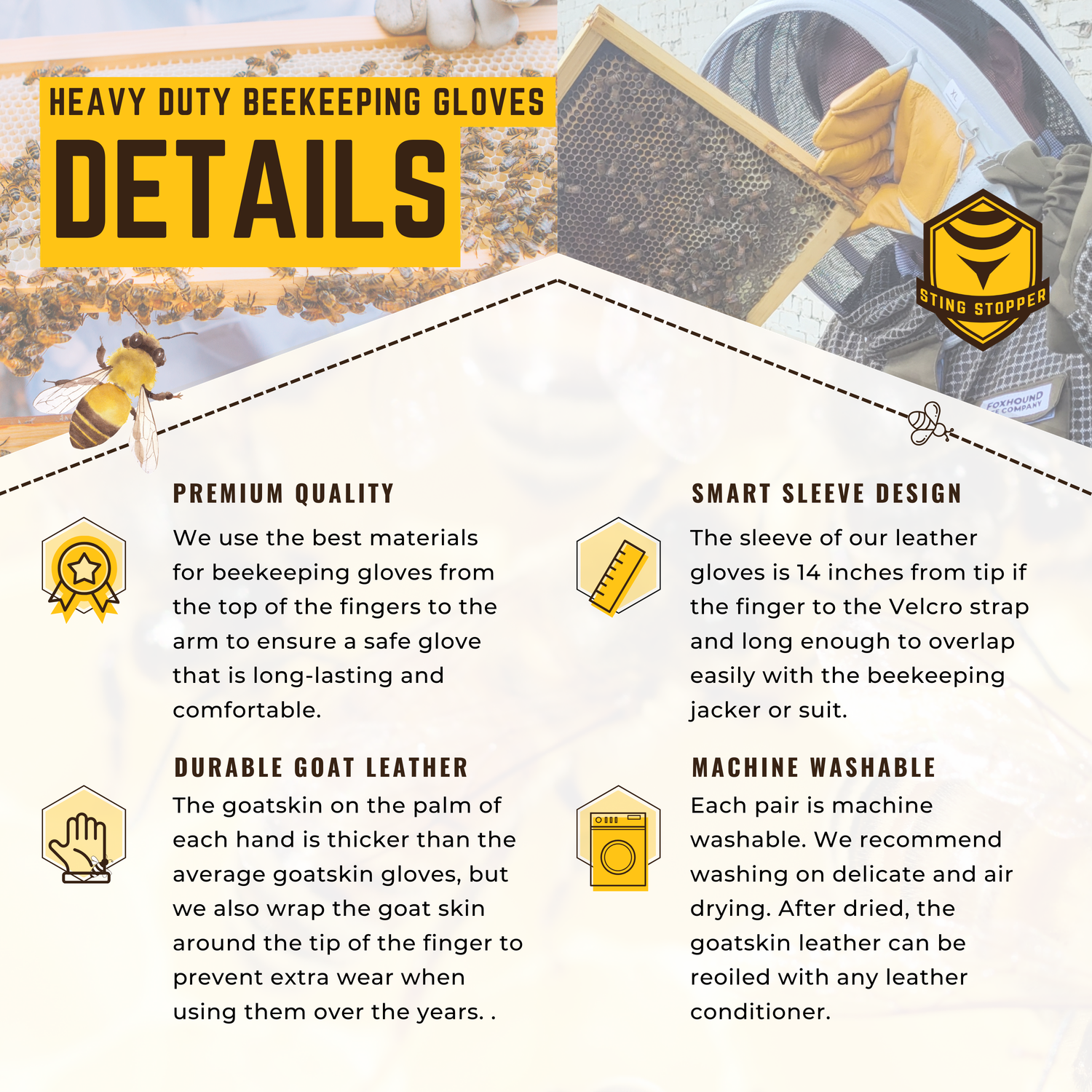 Look, beekeeping isn't a job for the faint of heart or the shoddy of glove. That's why we've designed the Sting Stopper™ gloves to be your hand's best friend. If Indiana Jones was a beekeeper, these are the gloves he would be using. Crafted with love (and a tad of obsession) from premium goatskin leather, these gloves laugh in the face of stingers. They're the VIP bouncers of the beekeeping world, keeping out bees, wasps, and hornets.